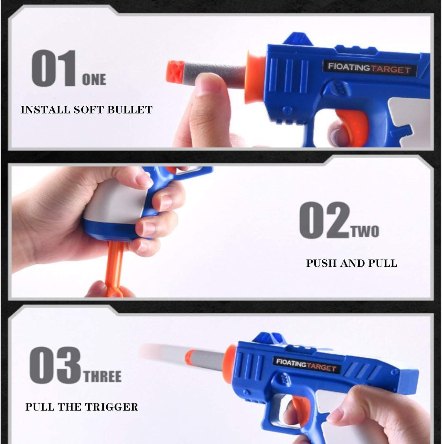 • This target shooting game comes with- 1 shooting toy gun, 10 foam-based softballs, 5 foam-based soft bullets, and 5 fixators.